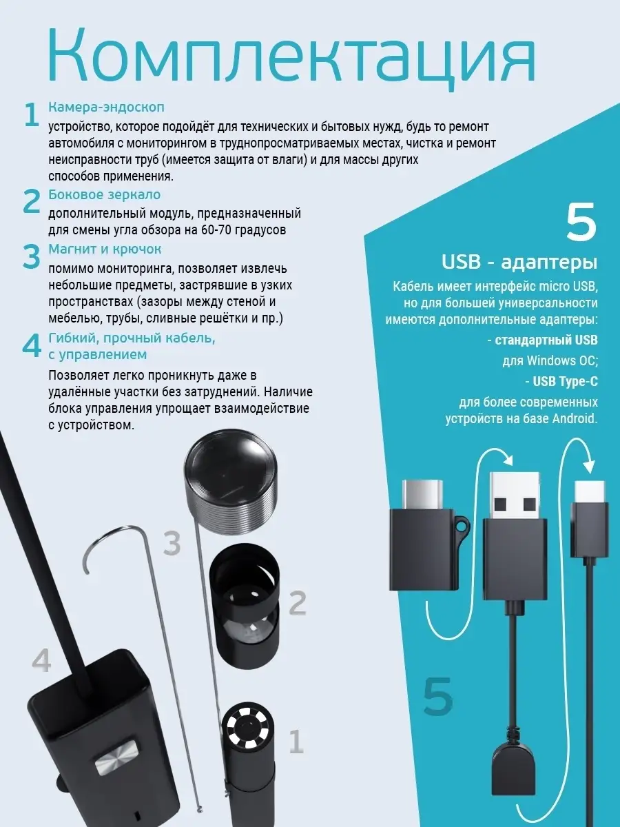 Эндоскоп пригодится для множества дел: осмотра труб, ремонта транспортных средств, автомобилей, оборудования, при монтаже и ремонте различных инженерных систем, строительстве, для работы лабораторий и мастерских по ремонту различного бытового оборудования. Он станет отличным приобретением для хозяйства или замечательным подарком!